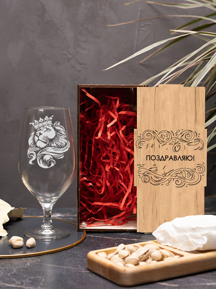 Изысканный подарочный бокал с утончённой гравировкой в виде величественного льва — это воплощение стиля и благородства в каждой детали. Изделие покоряет с первого взгляда своим безупречным исполнением и помещается в элегантную подарочную коробку из натурального МДФ, изготовленную вручную с особой тщательностью.