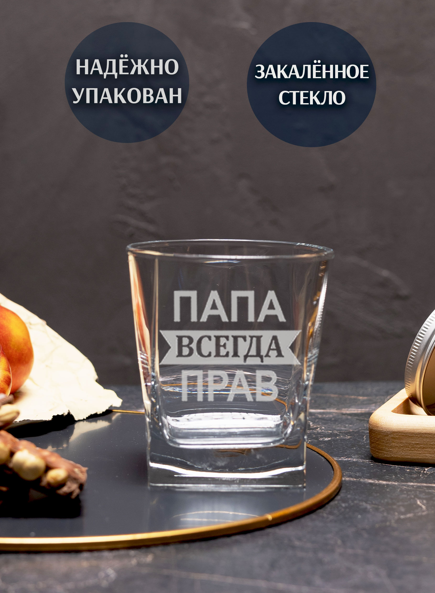 Бокал под виски “Папа всегда прав” с упаковкой подарочный с лазерной гравировкой. Бокалы для виски – это не просто посуда, это настоящее произведение искусства. Они изготовлены из высококачественного стекла, которое не только выглядит стильно и элегантно, но и обеспечивает идеальную прозрачность напитка.
