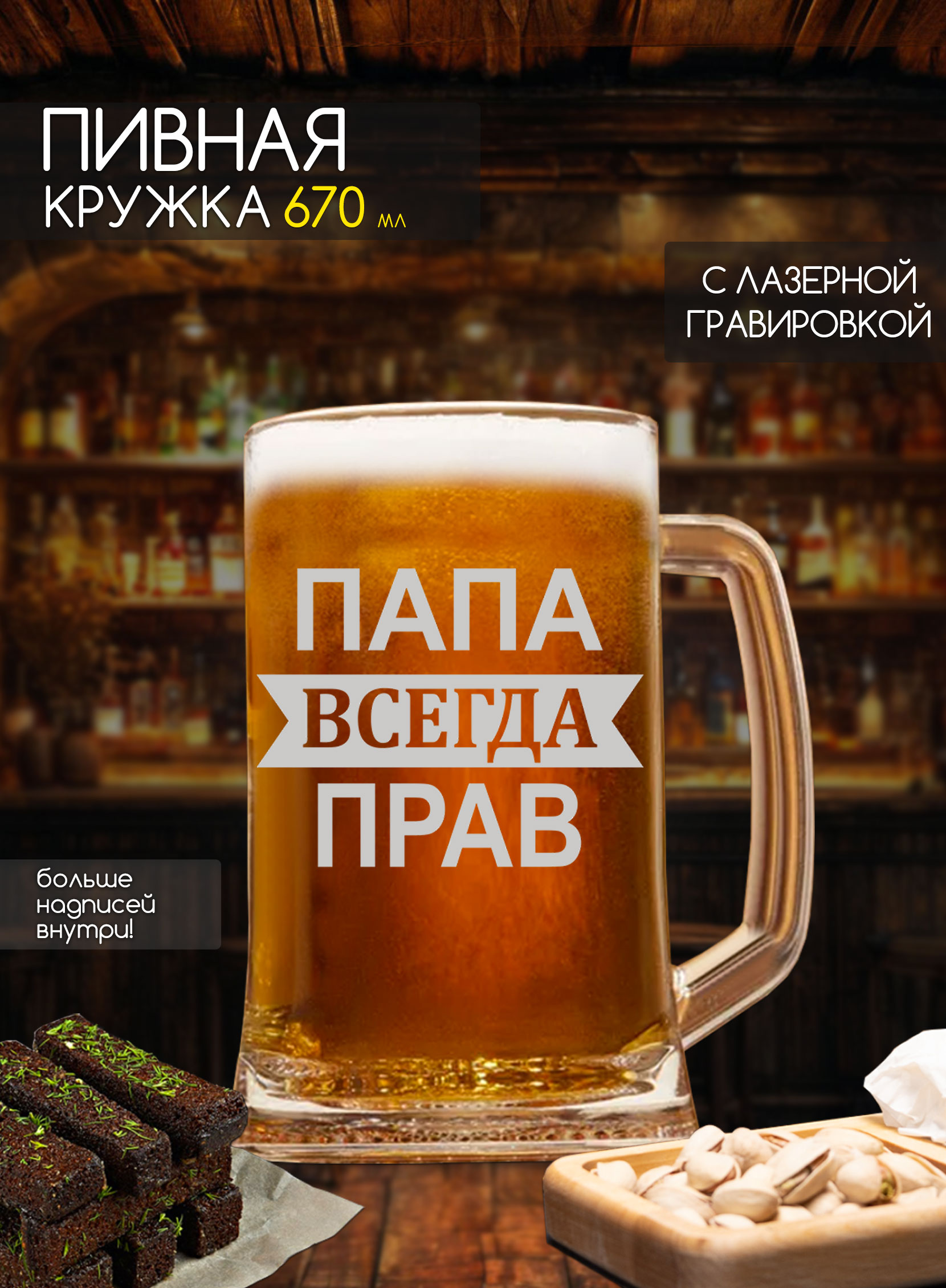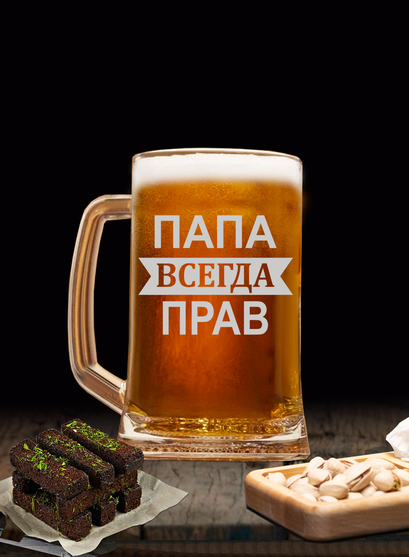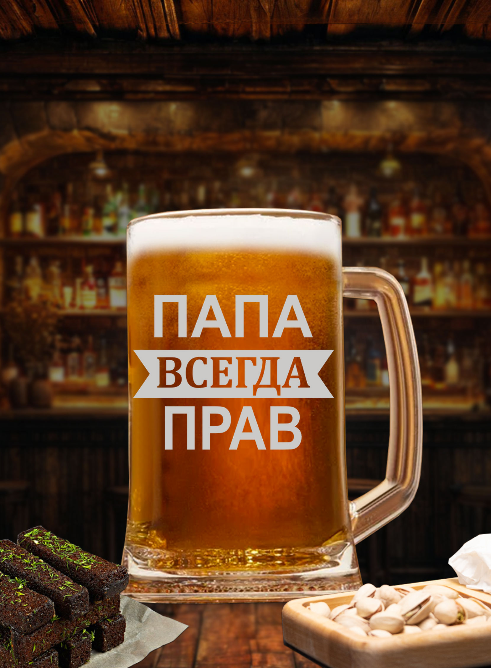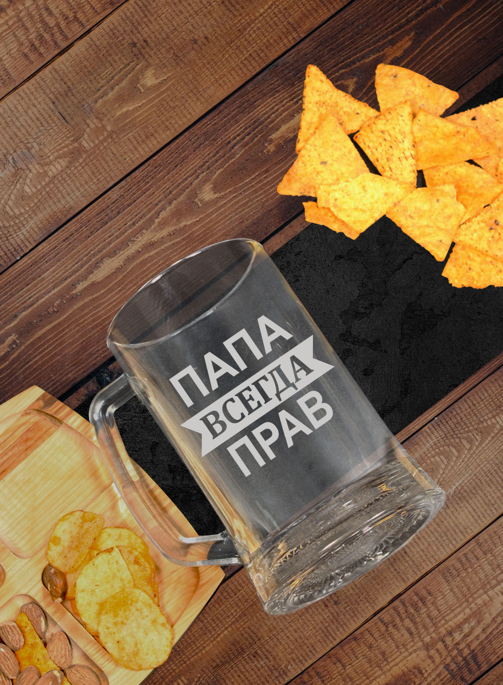 Пивная кружка “Папа всегда прав”! Этот невероятный аксессуар станет отличным дополнением к любому домашнему бару и порадует ценителей пива. Кружка изготавливается из высококачественного материала и имеет оригинальную гравировку, которая не только добавляет индивидуальности, но и делает ее незаменимой в коллекции ваших папиных принадлежностей. Благодаря удобной ручке и вместимости, она идеально подходит для вечерних посиделок с друзьями или уютного вечера дома.