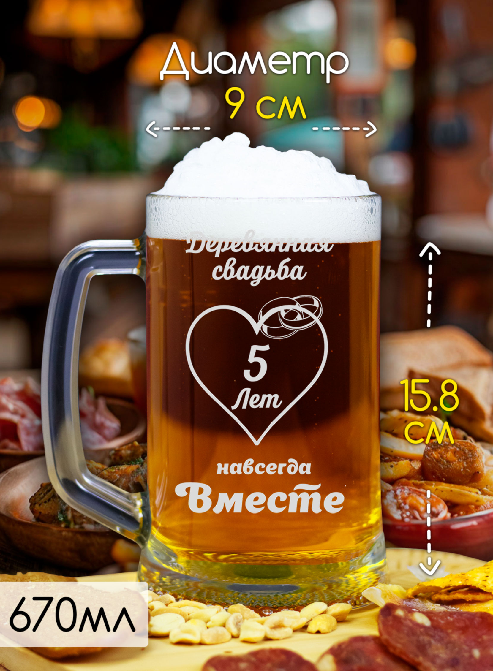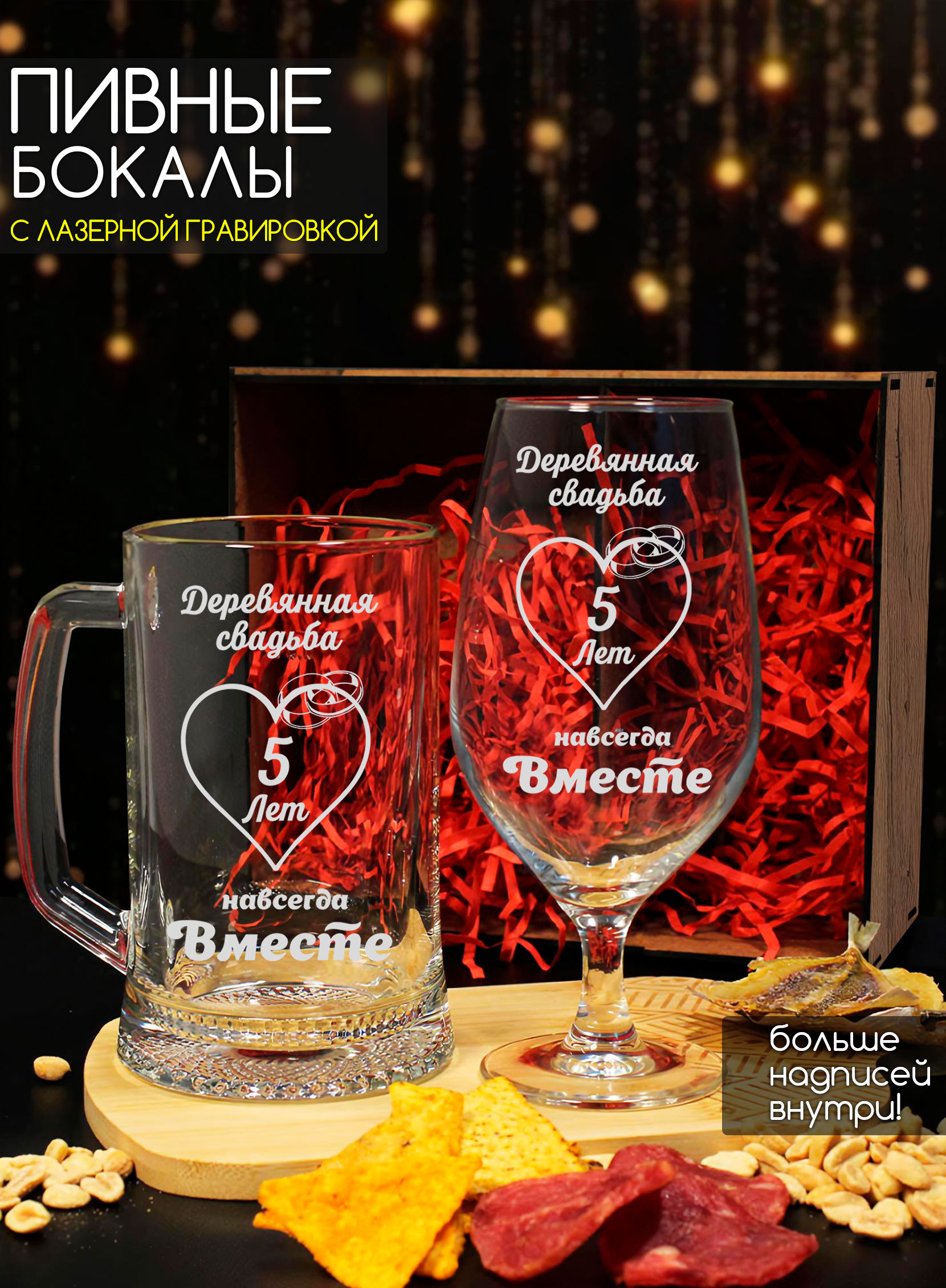 Пивной набор бокалов с гравировкой на годовщину Деревянной свадьбы 5 лет, идеально подойдет в качестве оригинального и практичного подарка. Это изысканный и практичный предмет для украшения стола во время торжества или ужина. Бокалы с гравировкой на юбилей свадьбы будет отличным сюрпризом юбилярам. Независимо от причины торжества, будь то день свадьбы, годовщина или юбилей – набор бокалов станет отличным подарком для молодоженов, супругов, друзей, родителей, родственников, коллеги или близкого человека. Наши бокалы можно купить как дополнение к основному подарку или как памятный презент для влюбленной пары. Они впишутся в любой интерьер и будут напоминать супругам о прекрасном памятном дне каждую годовщину. На бокалы жениха и невесты нанесена лазерная гравировка, которая не смоется и будет долго сохранять свой вид.
