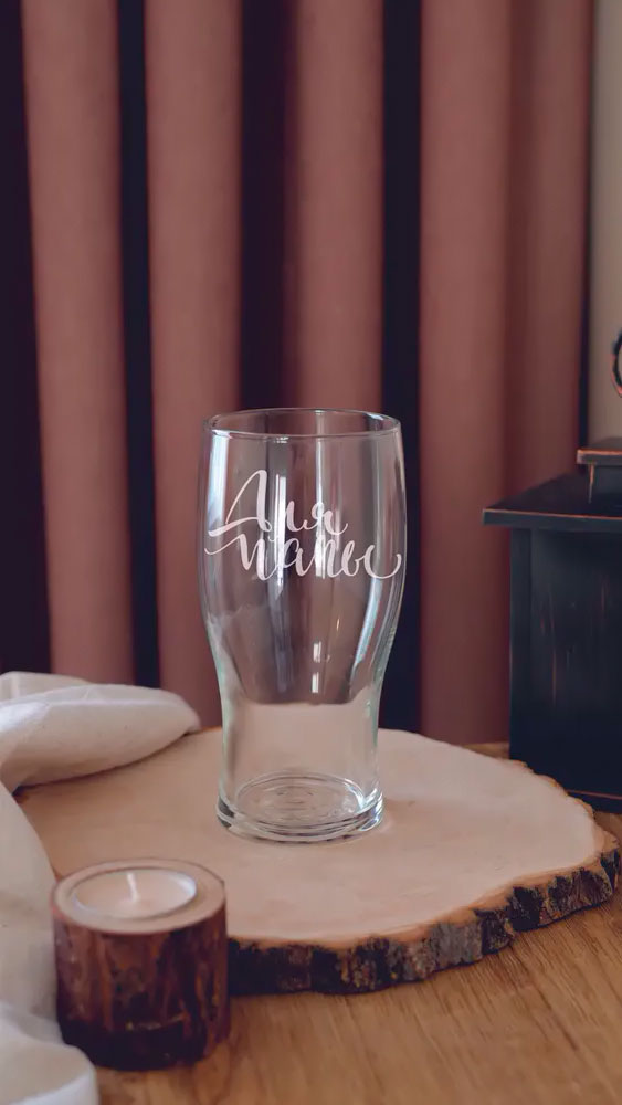 Лазерная гравировка на бокале для пива, сока воды вина не смоется и будет долго хранить свой вид.