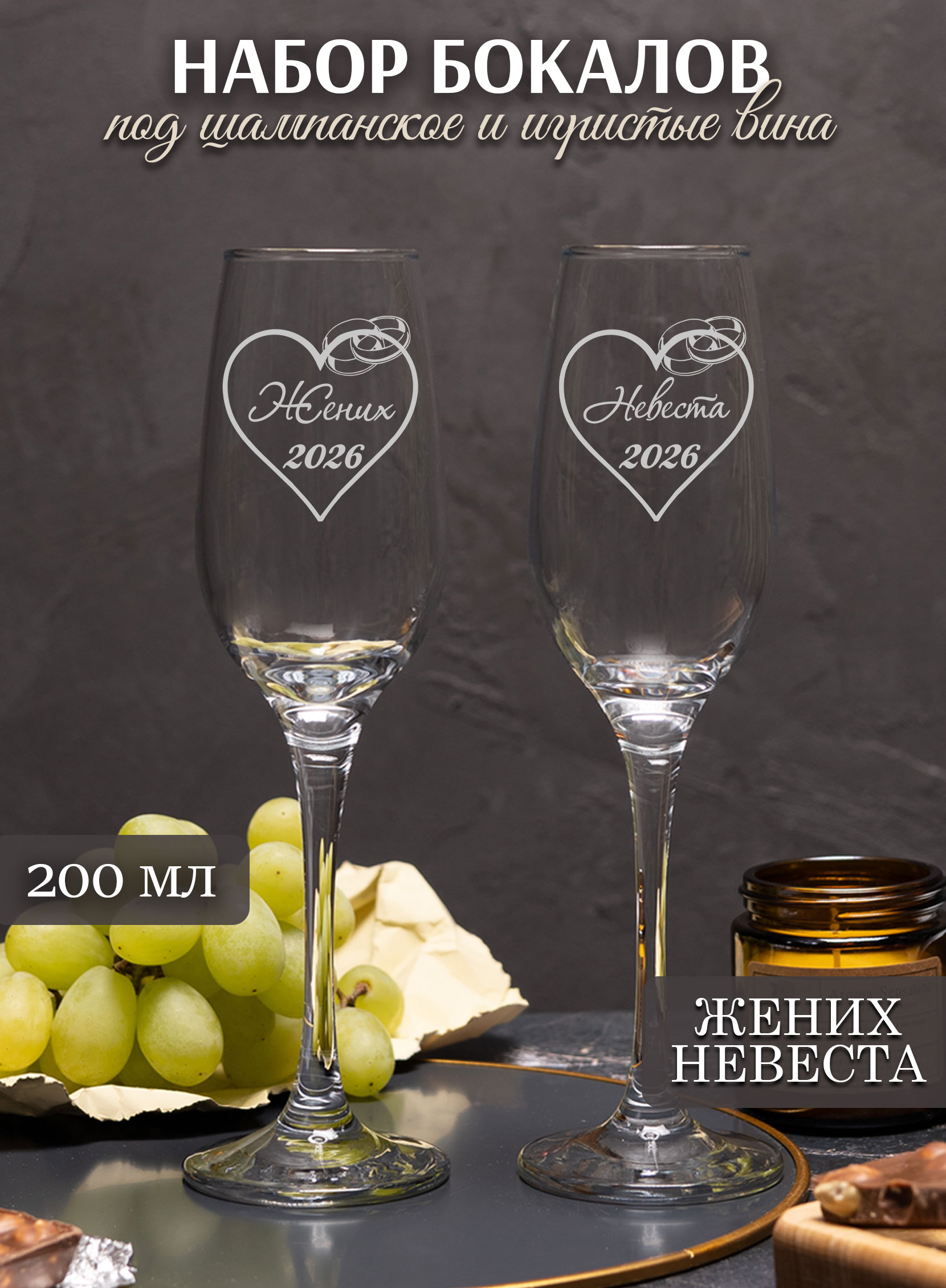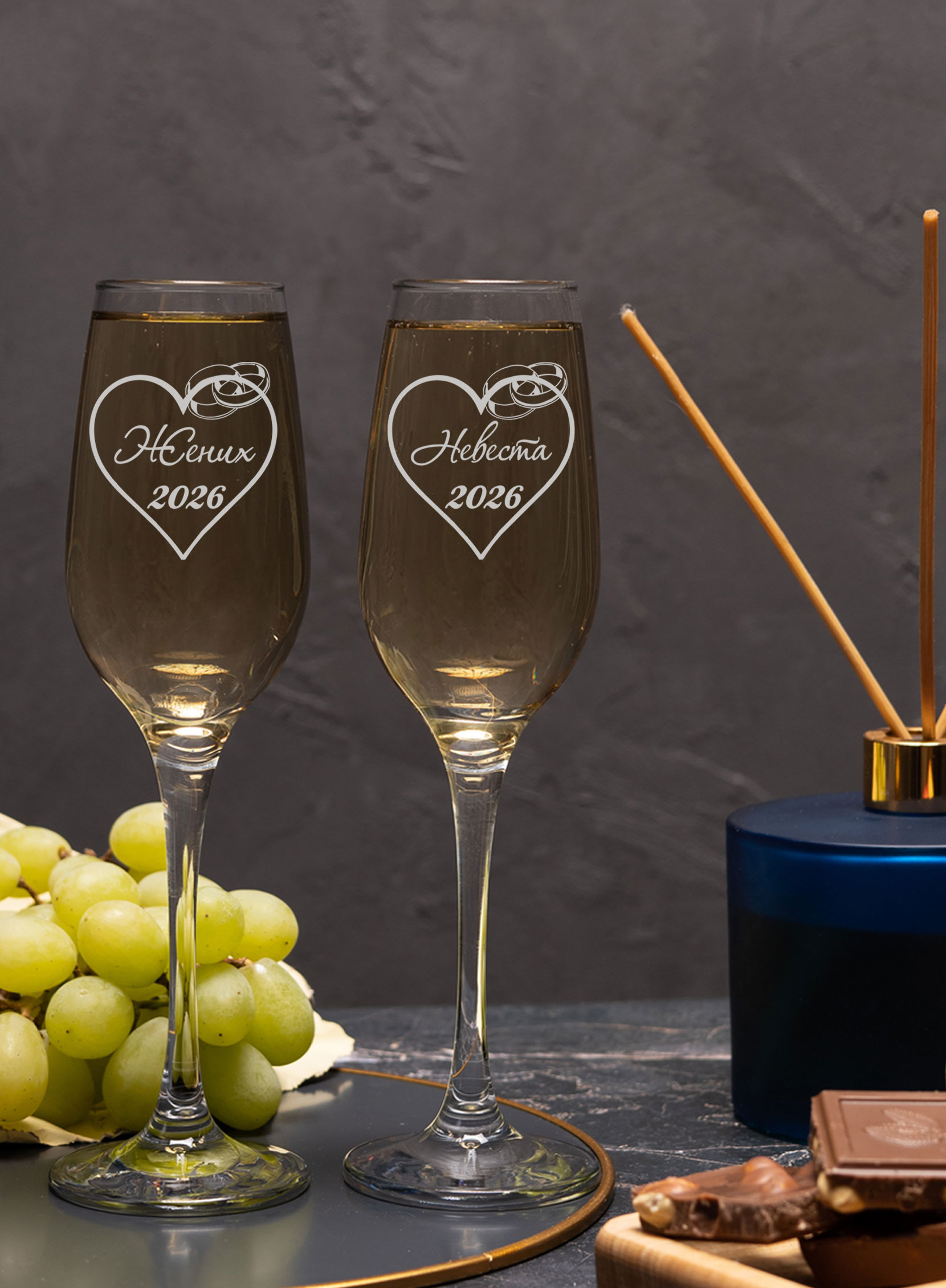 Свадебные стаканы с гравировкой «Жених невеста» – это особый атрибут, который подчеркивает важность и торжественность момента. Они символизируют начало новой жизни, счастье и любовь. Такие стеклянные бокалы для шампанского на свадьбу должны быть выполнены из качественных материалов, иметь красивый дизайн и соответствовать стилю торжества. Одним из самых популярных вариантов свадебных фужеров на выездной регистрации для жениха и невесты в 2026 году являются бокалы с гравировкой. Такие бокалы выглядят очень элегантно и необычно. Набор бокалов украсят свадебное платье невесты и костюм жениха, отлично подойдут для фотосессии при выездной церемонии. Если вы хотите сделать подарок друзьям на свадьбу счастливым молодоженам или сделать оригинальный подарок на годовщину родителям то можете подарить им набор из двух бокалов для шампанского с памятной гравировкой. Это будет не только красивый, но и полезный, оригинальный подарок. Молодожены смогут использовать его на своей свадьбе или на других торжествах. Наши свадебеные аксессуары в виде бокалов можно купить как дополнение к основному подарку или как памятный презент для влюбленной пары. Они впишутся в любой интерьер и будут напоминать супругам о прекрасном памятном дне каждую годовщину как свадебный декор. На бокалы жениха и невесты для шампанского нанесена лазерная гравировка, которая не смоется и будет долго сохранять свой вид. Наши бокалы также можно подарить на свадебную церемонию для украшения сервировки свадебного стола. Это, несомненно, подарит отличные эмоции! Также наши бокалы можно разбить на счастье и использовать как бокалы для битья. Наши бокалы можно подарить в виде прикольного подарка семейной паре Новый Год или 14 февраля. Будет отличным подарком на 15 лет свадьбы (хрустальная свадьба).